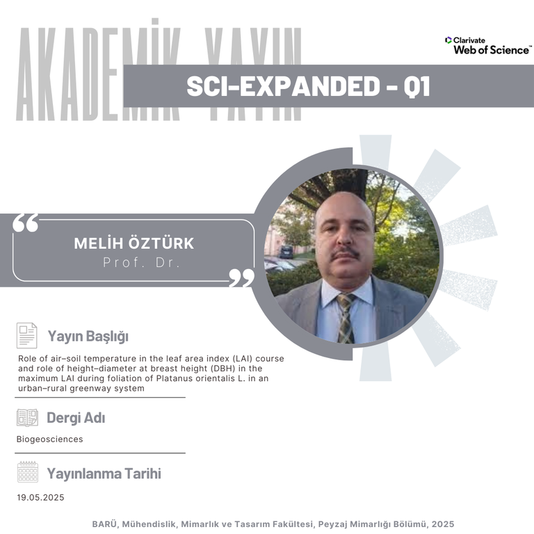 Our department faculty member Prof. Dr. Melih ÖZTÜRK's study titled "Role of air–soil temperature in the leaf area index (LAI) course and role of height–diameter at breast height (DBH) in the maximum LAI during foliation of Platanus orientalis L. in an urban–rural greenway system" has been published in the Biogeosciences journal.