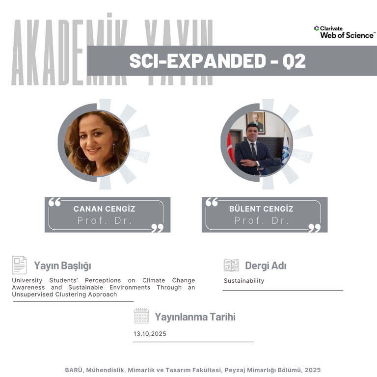 Our department faculty members Prof. Dr. Canan CENGİZ and Prof. Dr. Bülent CENGİZ's study titled "University Students’ Perceptions on Climate Change Awareness and Sustainable Environments Through an Unsupervised Clustering Approach" has been published in the journal Sustainability.