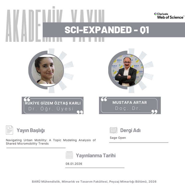 Our department's faculty members, Dr. Rukiye Gizem ÖZTAŞ KARLI and Assoc. Prof. Dr. Mustafa ARTAR, have had their study titled "Navigating Urban Mobility: A Topic Modeling Analysis of Shared Micromobility Trends" published in the journal Sage Open.