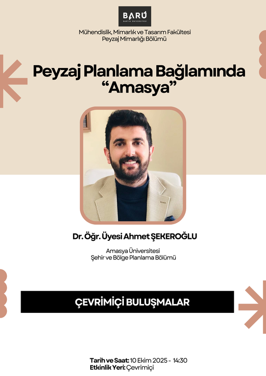 As part of the PEM 463 Landscape Planning Project V (Sections A and B) course, supervised by Dr. Pelin KEÇECİOĞLU DAĞLI and Dr. Rukiye Gizem ÖZTAŞ KARLI, students continue their study of the city of Amasya. Within this scope, on Friday, October 10, 2025, at 2:30 PM, Dr. Ahmet Şekeroğlu from the Department of Urban and Regional Planning at Amasya University will give a presentation titled "Amasya in the Context of Landscape Planning." In this online event, the city's spatial characteristics, planning processes, and landscape values will be shared with the students.