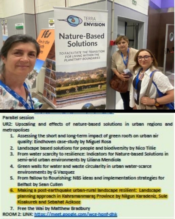 Our department's faculty member, Prof. Dr. Sebahat Açıksöz, participated in the "TERRAenVISION 2025_Nature-based Solutions to Facilitate the Transitions for living within the Planetary Boundaries" Congress, organized by the University of Granada in Granada (Spain) between July 8-11, 2025, with a paper titled "Making a post-earthquake urban-rural landscape resilient: landscape planning approach in Kahramanmaraş Province". The paper was prepared in collaboration with Prof. Dr. Nilgül Karadeniz (Ankara University) and Assoc. Prof. Dr. Şule Kısakürek (Kahramanmaraş Sütçü İmam University) and presented orally.